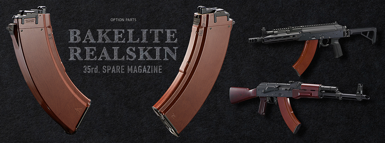 It has a capacity of 35 rounds. Tokyo Marui manufactures magazines in the Bakelite style using aluminum die-casting for seamless integration.