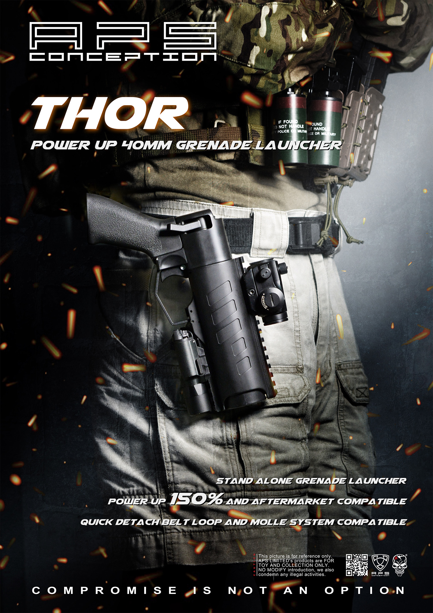 Compare to other existing Grenade Launchers in the market, APS “THOR” Grenade Launcher gives you a 150% power up of your M203 Grenade. Base on our testing, the power, the speed of the grenade has significantly improvded. THOR Grenade Launcher is compatible with aftermarket 40mm Grenades, which means it is capable of using a wide variety of M203 Shells that can shoot anything from BB's and paintballs to foam rockets and Nerf footballs, not to mentioned, It works perfectly with our APS Hell Fire Grenade and that can fully release its latent power.