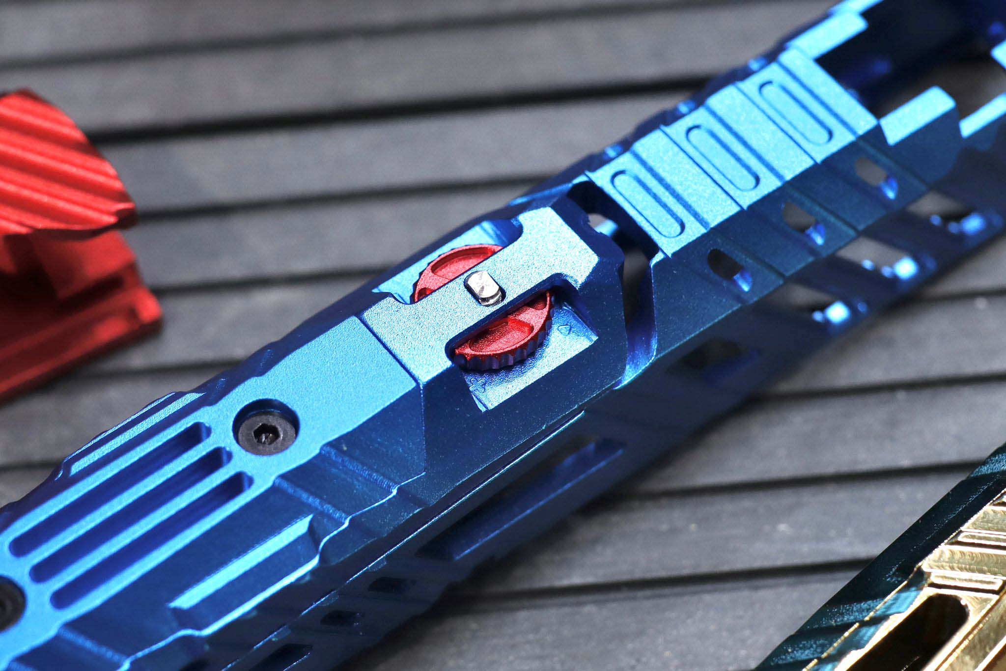 CTM SUPERLINE Hi-CAPA Split-Slide is a revolutionary product designed to provide unbeatable durability and performance. It is made of high-precision 6061 CNC aluminum and features a split-slide and fixed barrel design, which makes it lightweight and agile. The 5.1 slide weighs only 38.6g (1.36oz), allowing for quick and maneuverable action on the field. Equipped with a TDC wheel design, it ensures precise accuracy and allows players to adjust the hop-up easily without taking down the slide, giving you the upper hand in every shot. The SUPERLINE Split-Slide is equipped with ambidextrous charging handles, which provide added convenience and ease of use for both left and right-handed shooters. It is also compatible with Tokyo Marui original rear sight, giving players different options. The outer barrel features an integrated optic plate that provides an absolute co-witness sight picture, giving you pinpoint accuracy even in the most challenging situations. An extra optic riser plate will be included in the package for more optic choices. It is recommended to cancel the slide-stop function and use the Short Stroke Kit and the enhanced nozzle spring included. Our exclusive non-tilting block design can improve accuracy and performance by fixing the hop-up chamber and the outer barrel.