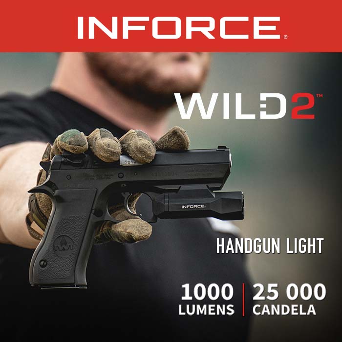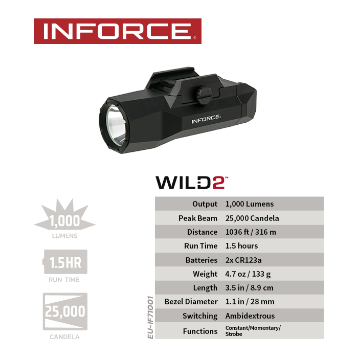 The WILD2 provides 1000 lumens of white light with up to 1.5 hours of runtime. Ultra-light and durable, weighing 4.7 ounces, it provides a well-defined hotspot with the perfect balance of spill. WILD2 is primarily made out of 6061-T6 aluminum and a Type III MIL-SPEC hard anodize finish. The device is impervious to dust, sand, and dirt, and is waterproof to 66 feet. Mount the WILD2 in seconds to any gun equipped with a 1913 (e.g., Sig Sauer P320) or Glock Universal (e.g., Gen 3 or Gen 4 Glock) rail. Transition between rail types by reversing the patented INFORCE crossbar in the mounting fixture. All three functions "constant, momentary, and strobe” are activated by pressing laterally on either the left or right paddle.