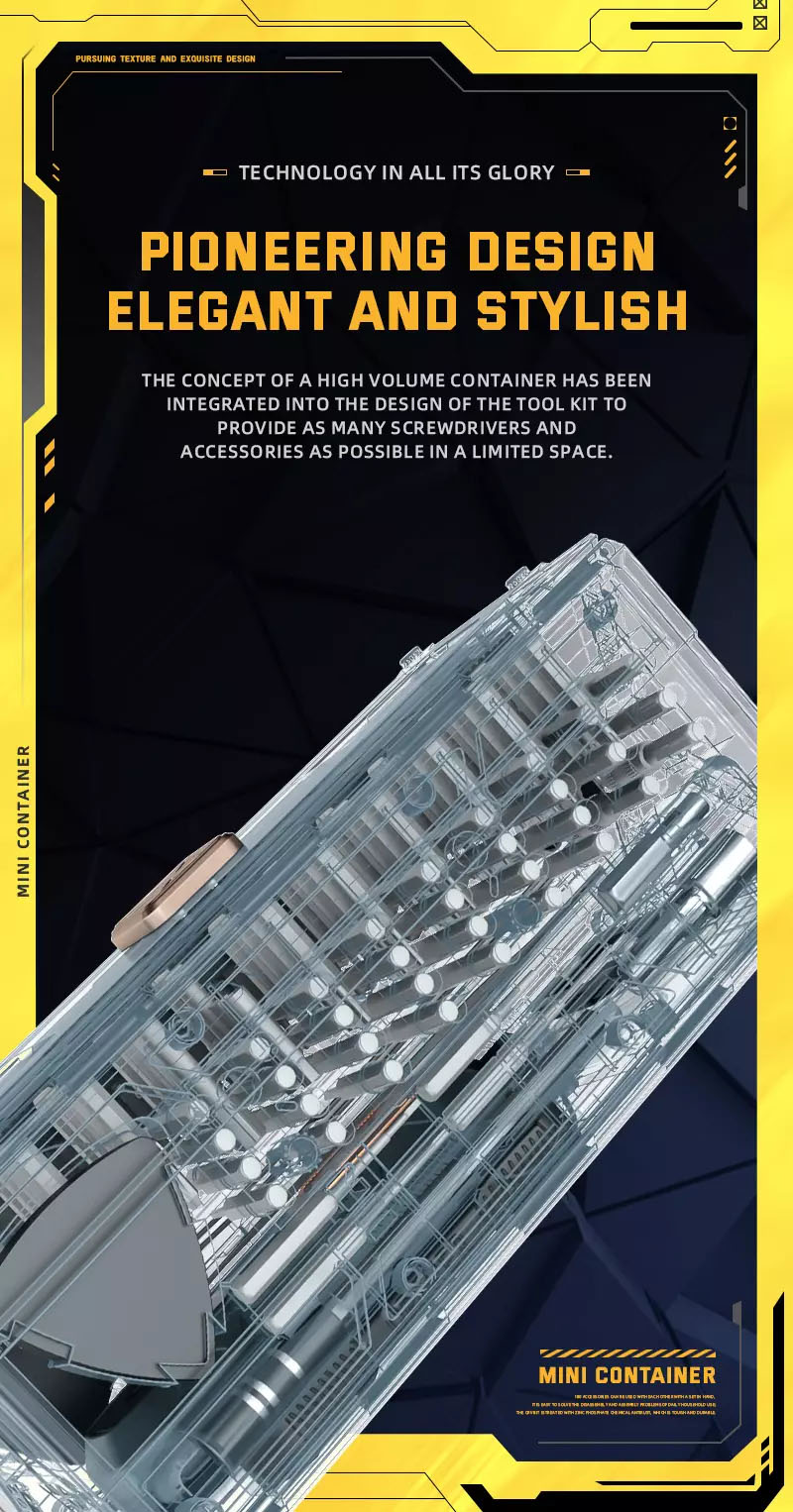 Pioneering design elegant and stylish: The concept of a high volume container has been integrated into the design of the tool kit to provide as many screwdrivers and accessories as possible in a limited space.