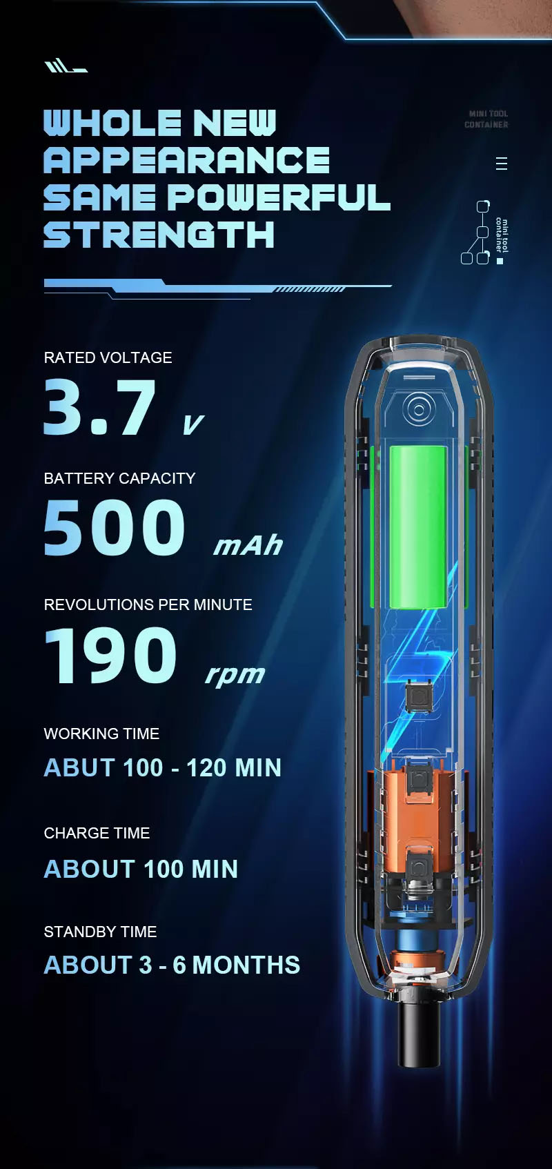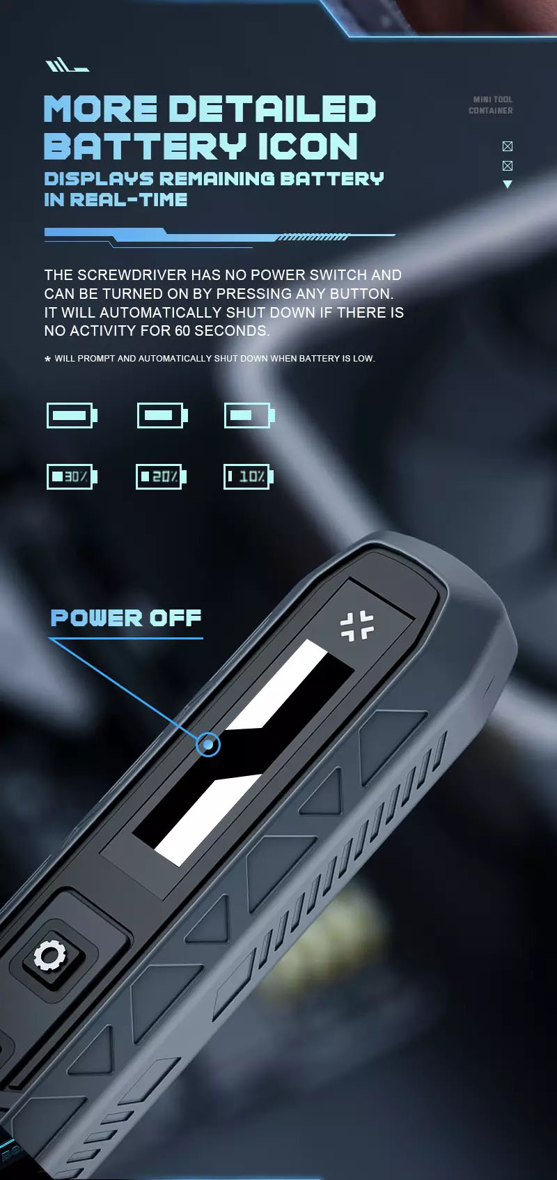 More detailed battery icon, displays remaining battery in real – time: The screwdriver has no power switch and can be turned on by pressing any button. It will automatically shut down if there is no activity for 60 seconds. (will prompt and automatically shut down when battery is low.)