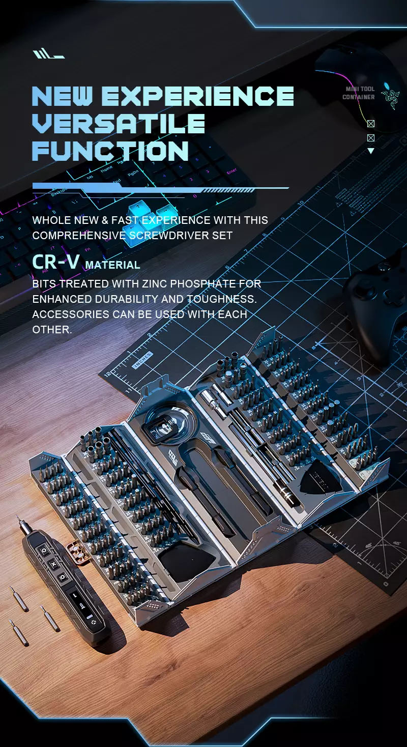 New experience versatile function: Whole new and fastexperience with this comprehensive screwdriver set. CR-V material bits treated with zinc phosphate for enhanced durability and toughness. Accessories can be used with each other.