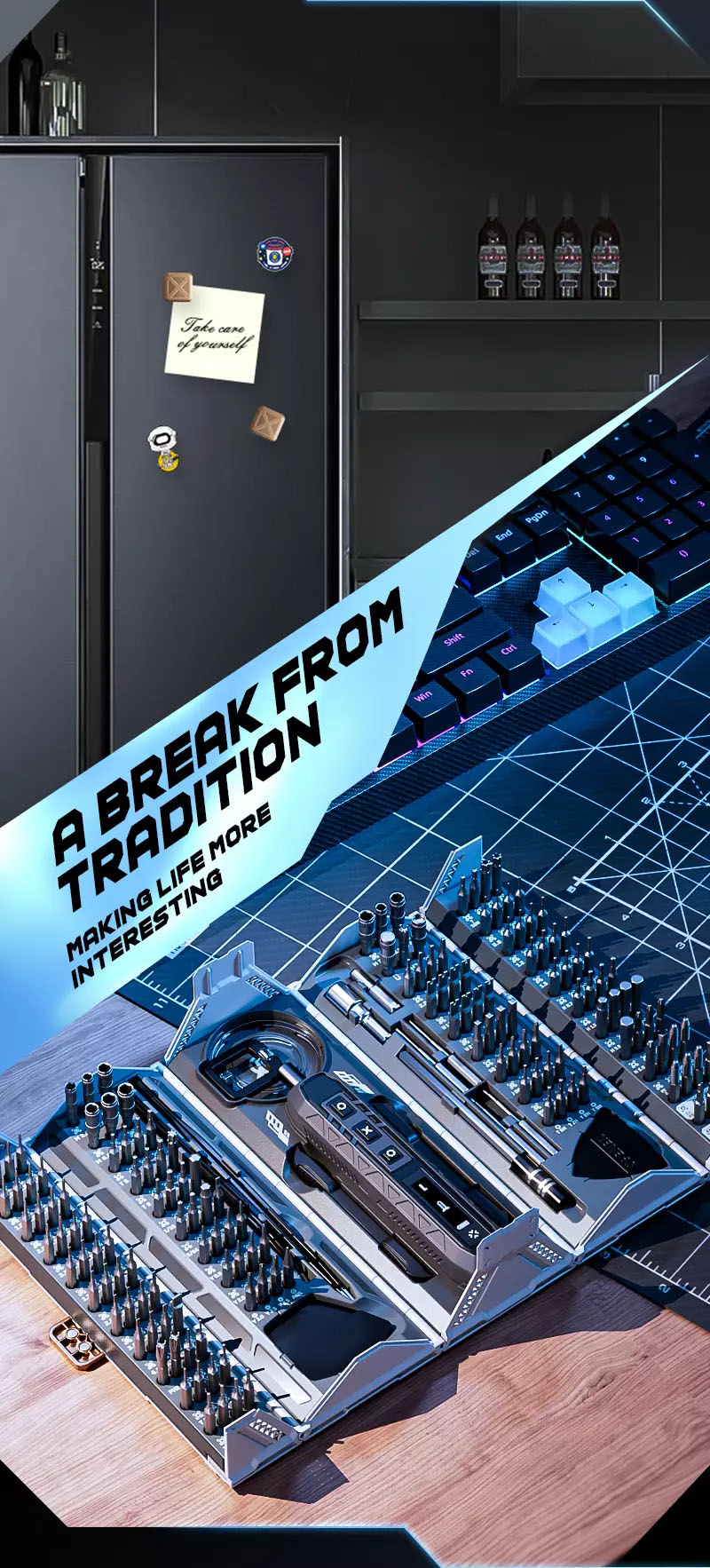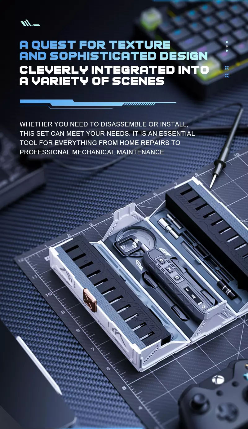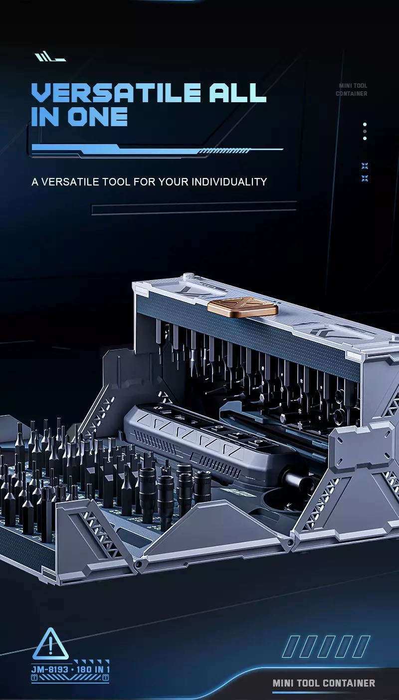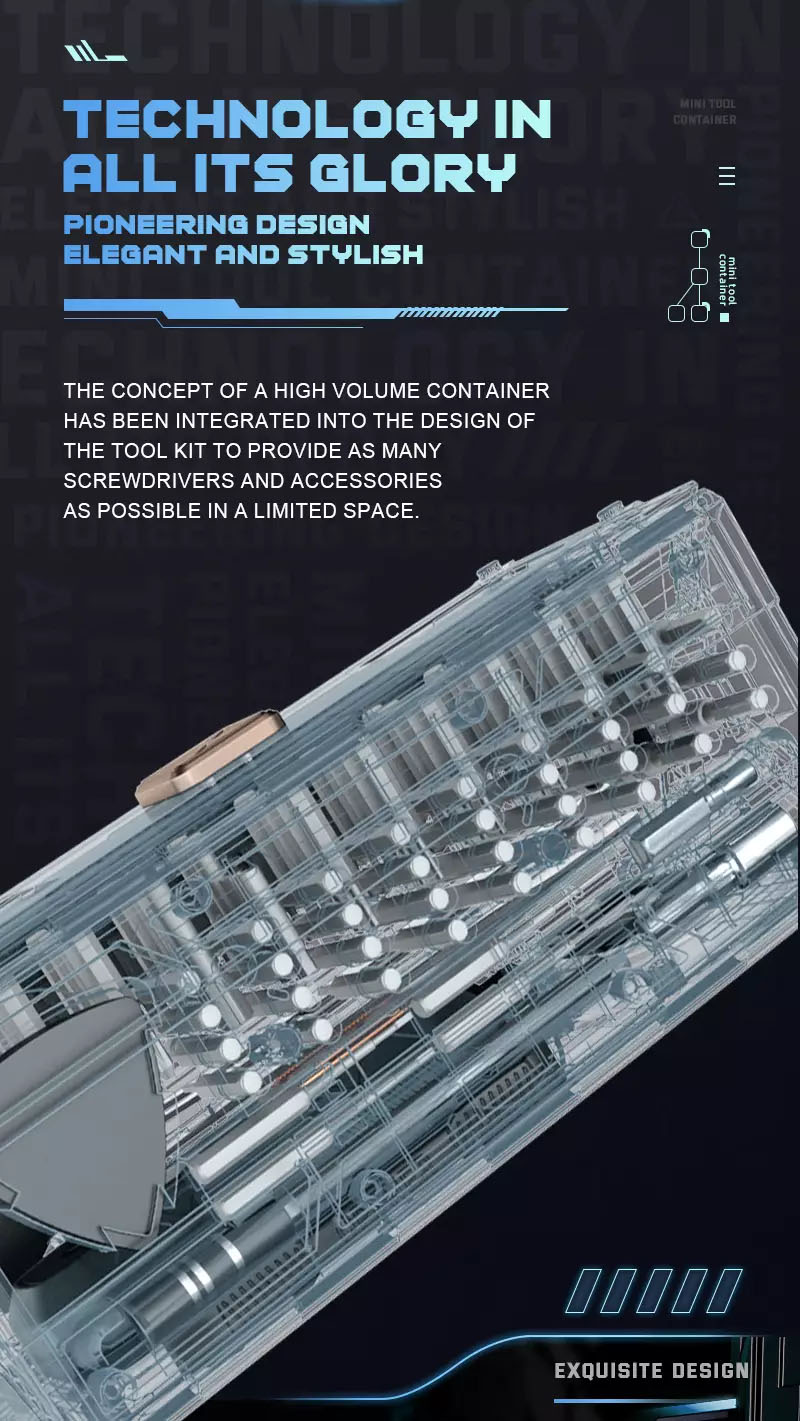 Versatile all in one: A versatile tool for your individuality. Technology in all its glory pioneering design elegant and stylish: The concept of a high volume container has been integrated into the design of the tool kit, to provide as many screwdrivers and accessories as possible in a limited space.