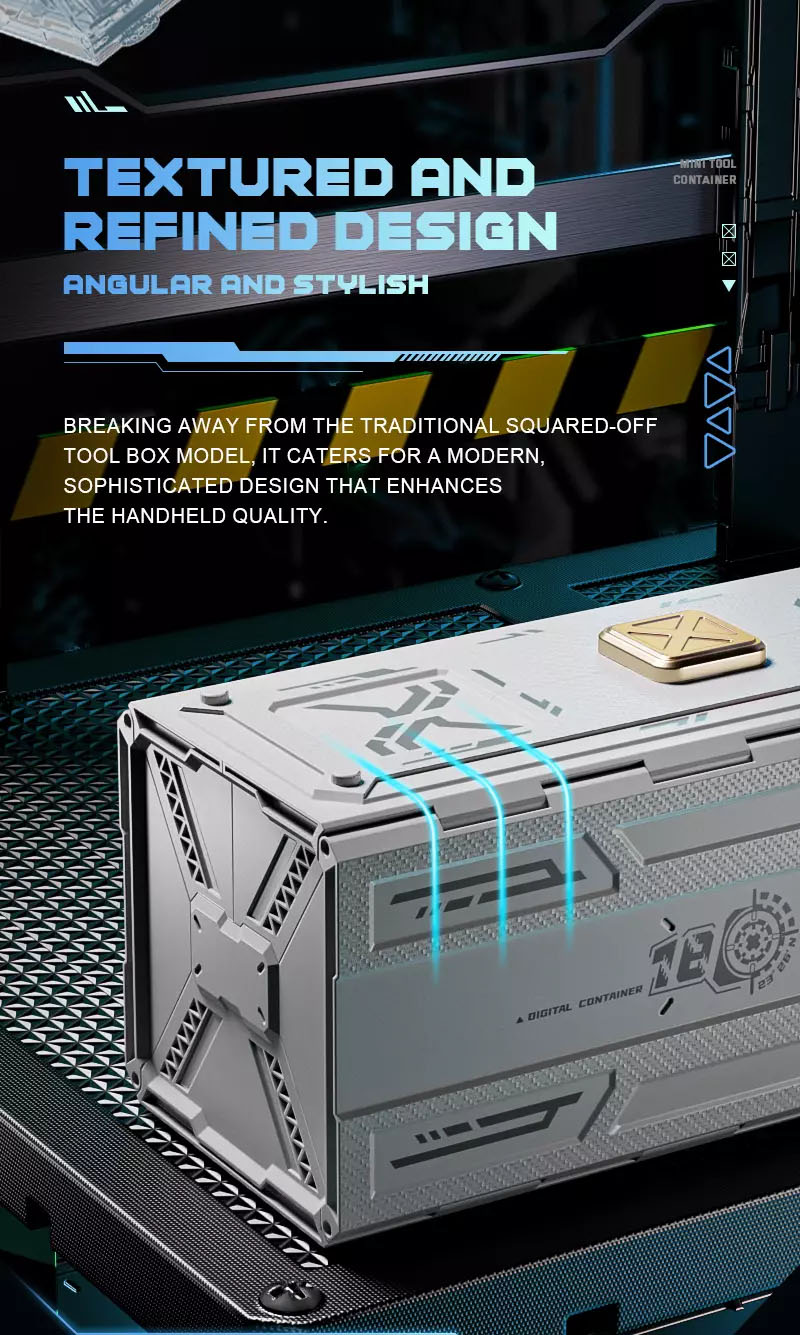 Textured and refined design, angular and stylish: Breaking away from the traditional squared-off tool box model, it caters for a modern, sophisticated design that enhances the handheld quality.