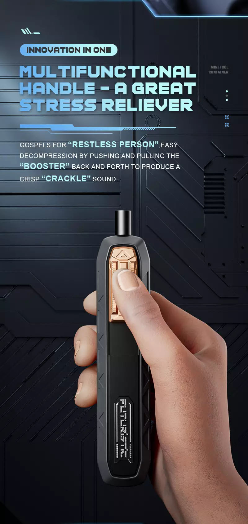 Innovation in one – multifunctional handle – a great stress reliever: Gospels for “restless person”, easy decompression by pushing and pulling the “BOOSTER” back and forth to produce a crisp ”CRACKLE” Sound.