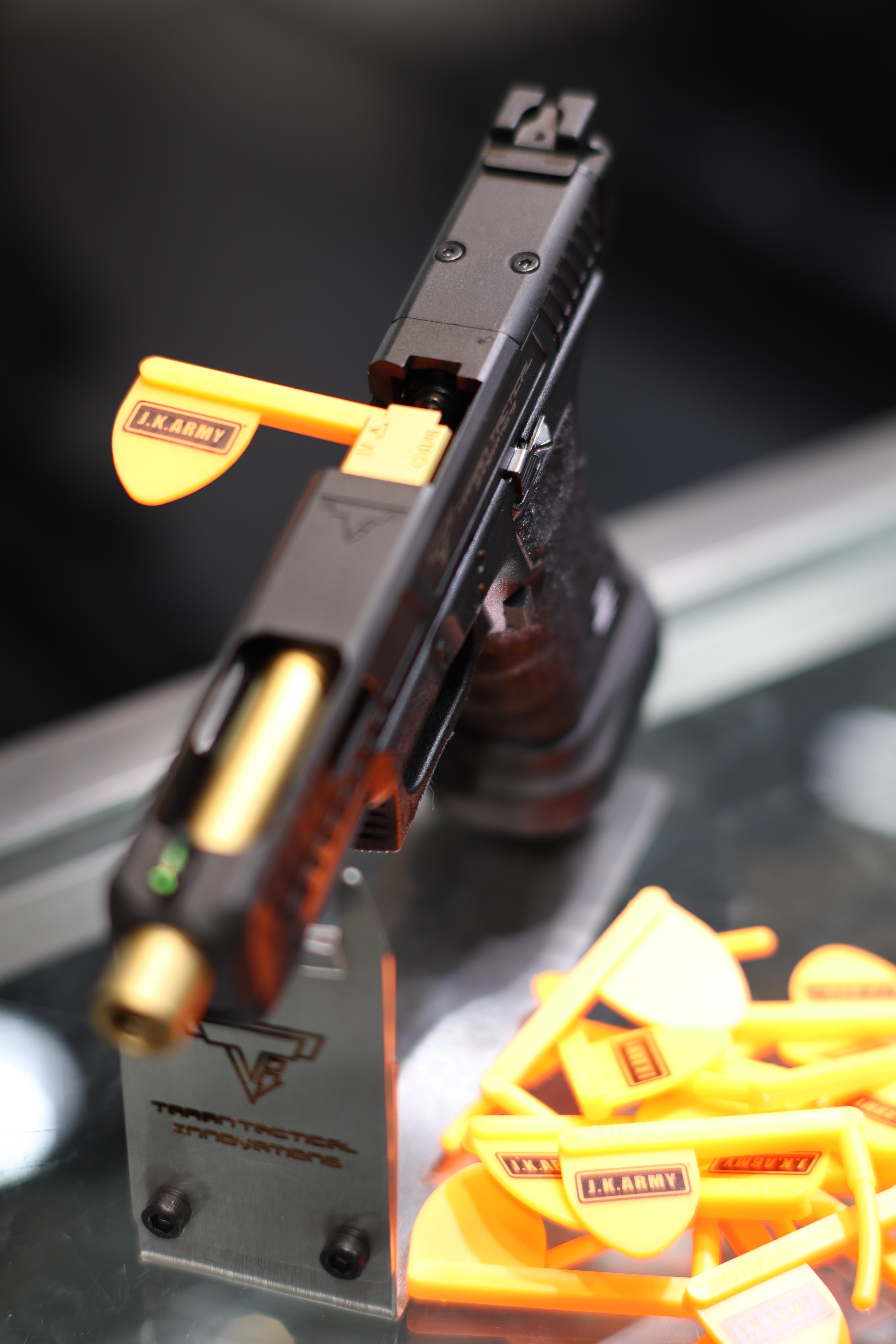 The purpose of the Chamber Safe Flag is to prevent accidental discharge and promote safe handling and storage of guns. Inserting the Chamber Safe Flag into the chamber physically blocks the Inner barrel and acts as a visual reminder that the gun is in a safe condition.