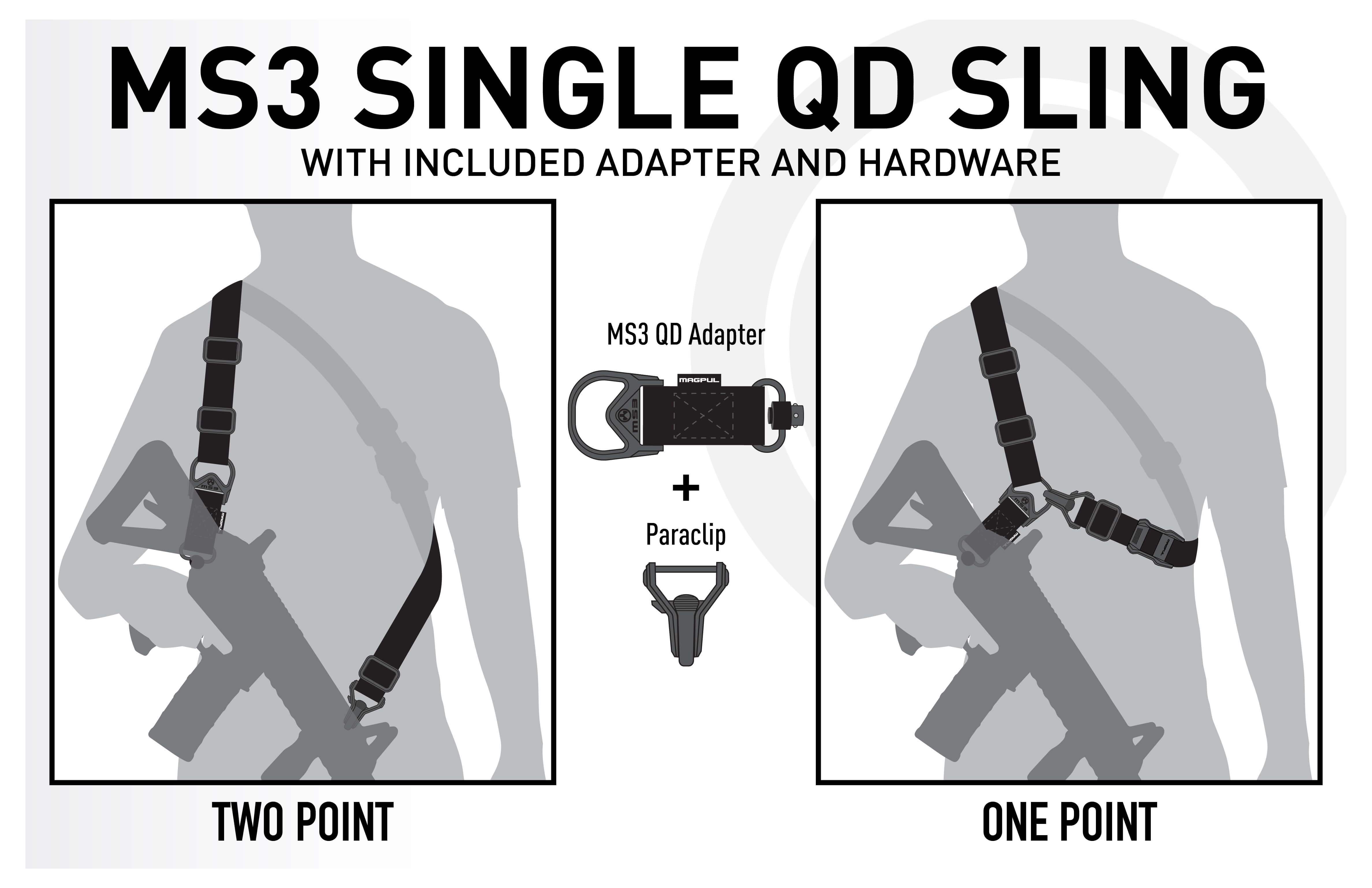 Filling the same mission requirement as the standard MS3 Sling, the MS3 Single QD can quickly switch between one-point and two-point configuration. The MS3 Single QD maintains material construction and specifications identical to that of the standard MS3, but features a heavy-duty push-button QD Sling Swivel for the one-point (rear) weapon attachment rather than the Magpul Paraclip™.