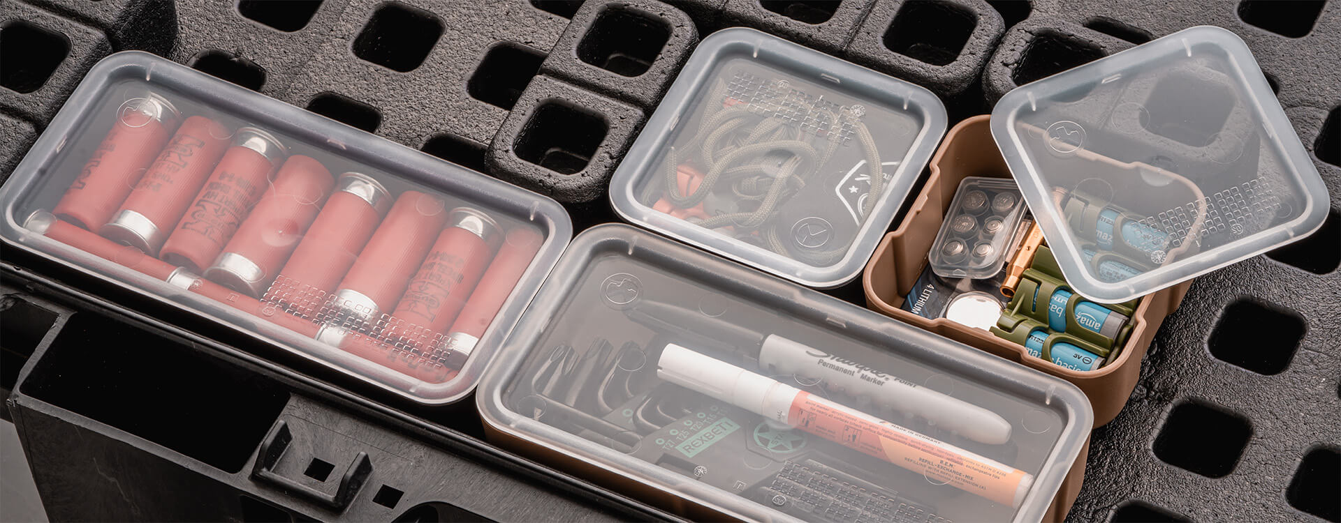 Made from sturdy polymer and designed for rugged use with 0.1ʺ thick walls to protect whatever is placed inside, they are available in Black, FDE, and Red so the colors can be used as a quick reference of your loadout. DAKA Bins also utilize transparent lids for easy contents identification, and the reinforced lid snap tabs lock securely with the Bin sides to keep them securely closed. For further organization, paint-pen dot matrix panels on the lids give users additional identification capability.