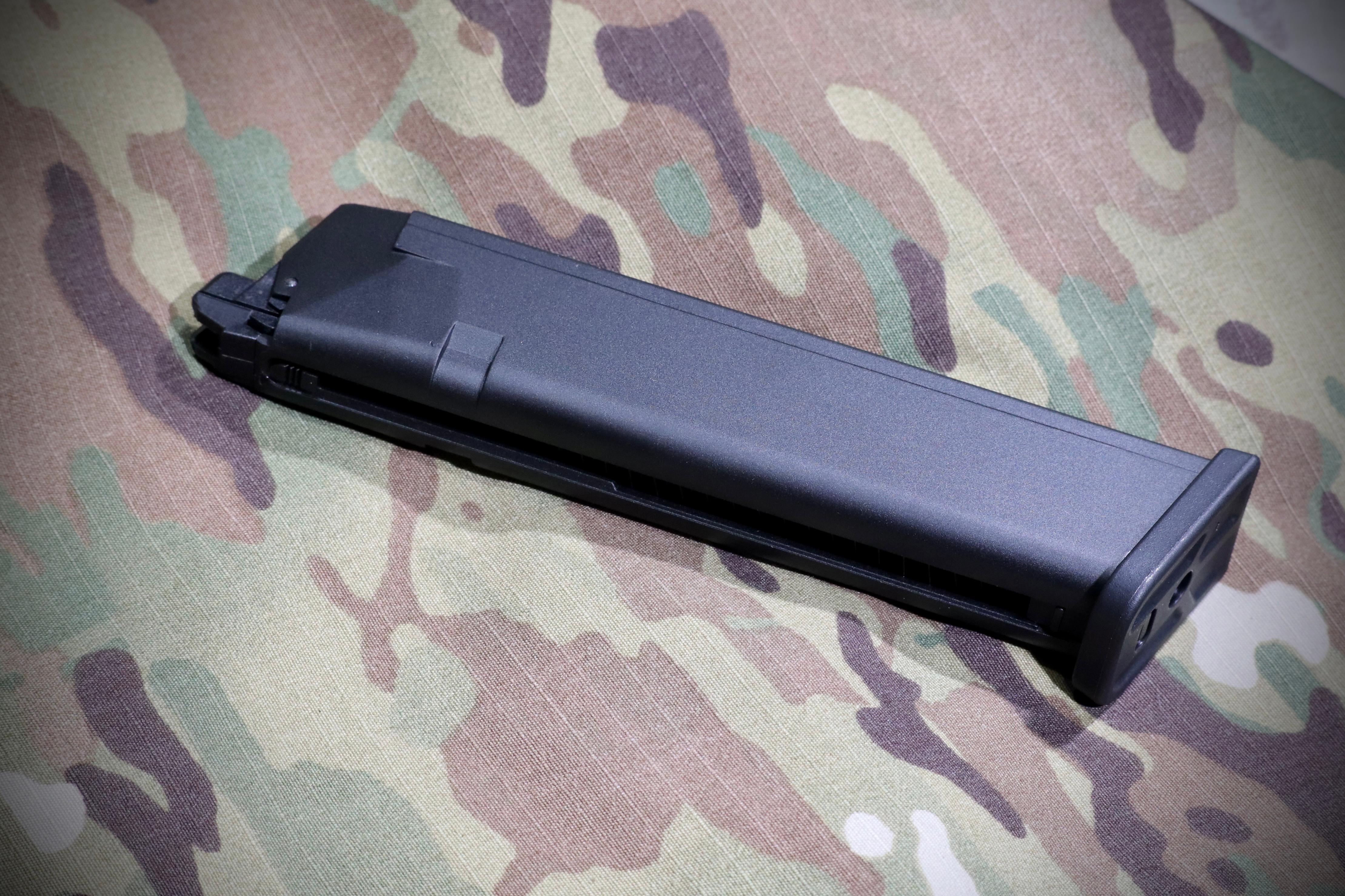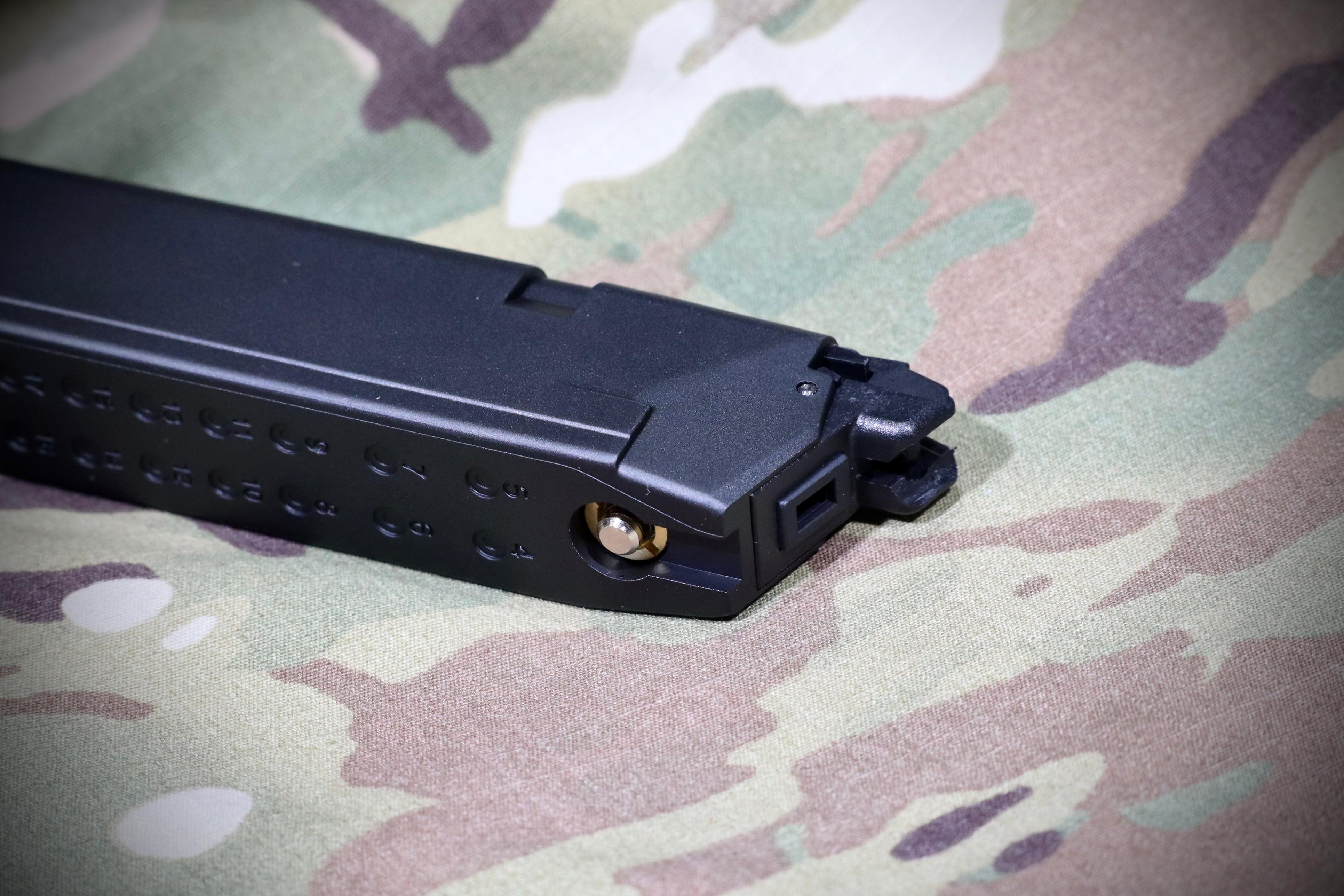 The MAXTACT GMG-17 32 Rounds Extended Co2 Magazine maybe one of the best G-Model extended magazine in the market. The Aluminum constructed magazine is very lightweight, which it only weights 219.4g, with the height of 170mm. The magazine can be set into the pistol with a "just all-right" extended length, proving the extra 5 rounds capacity. The round tube air chamber design is used for maximum strength, also ensuring a stable and consistent gas supply, which can definitely maximise your Airsoft pistol's performance. CNC-machined bottom block with extra fine threads is also equppied in order to prevent gas leakage.