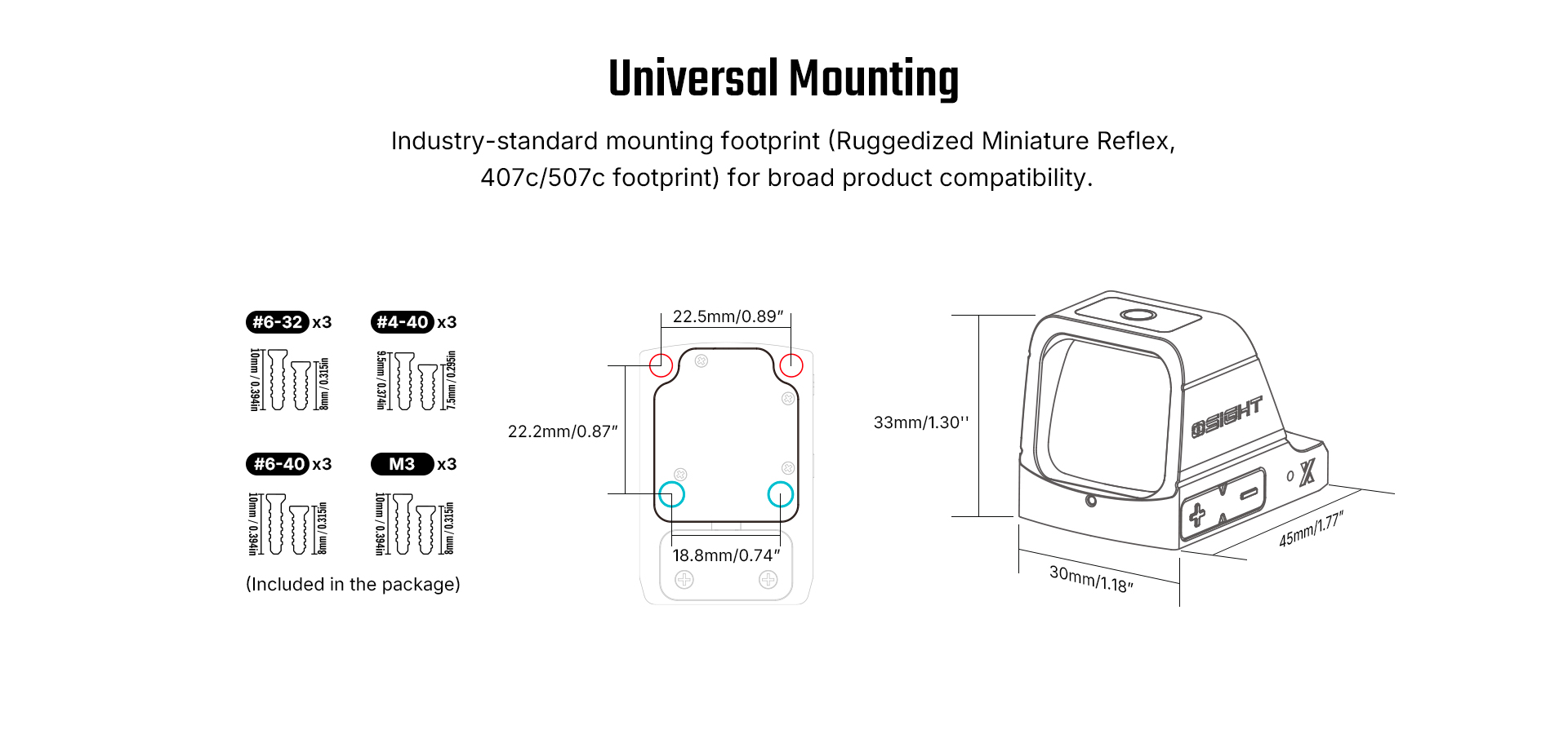 By adopting the industry-standard mounting footprint (Ruggedized Miniature Reflex, 407c/507c footprint) for optic cuts, the Osight X ensures versatility and ease of integration(use included screws).