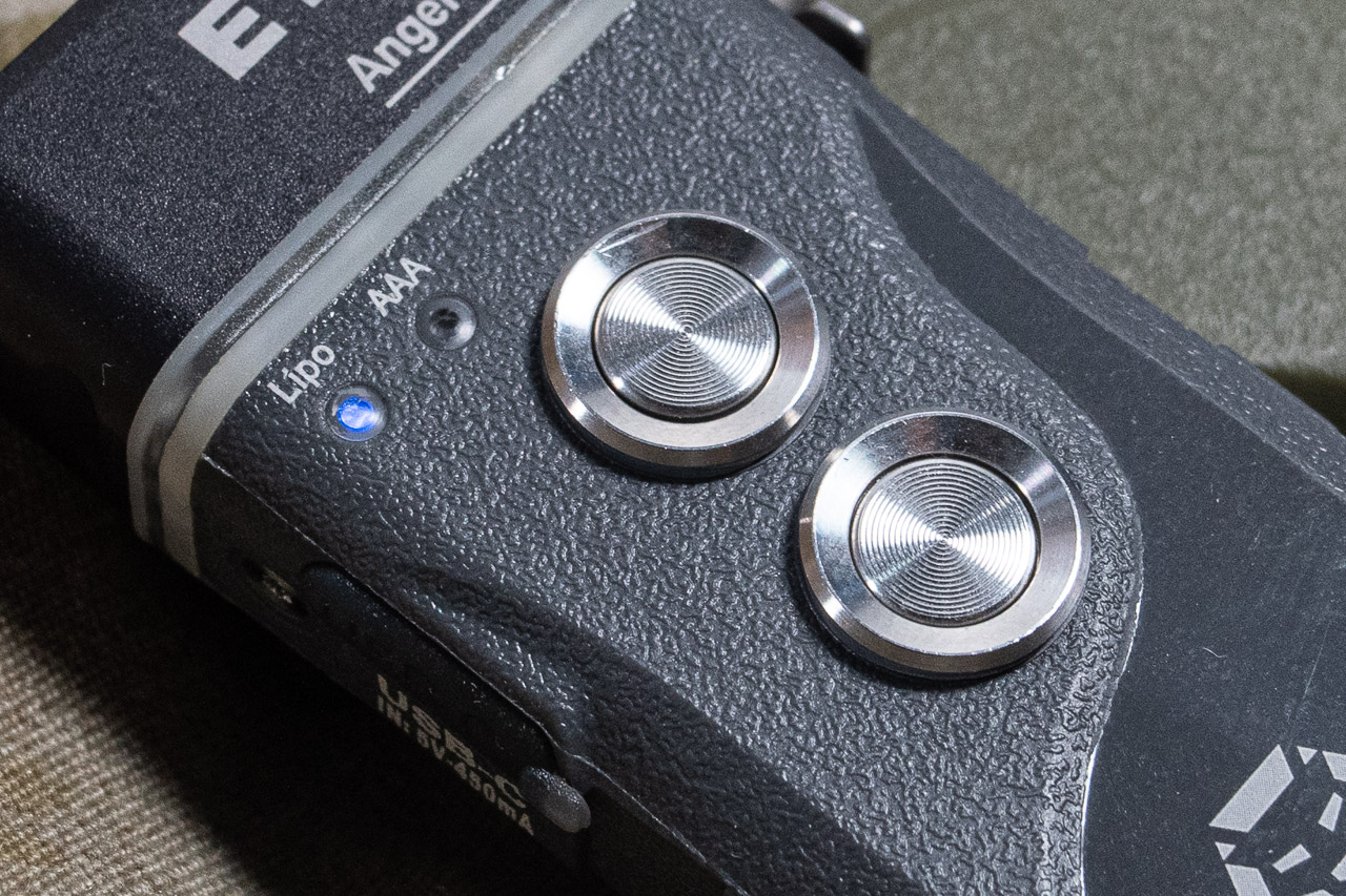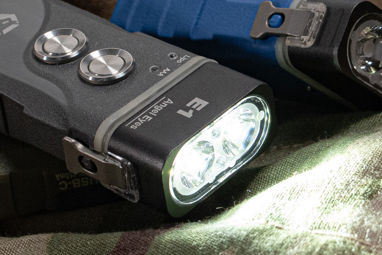 The E1 has some changes compared to the first Angel Eyes model - E3, other than the material. It has a dual button, one has the same function as the E3 and another button is dedicated for quick access to Strobe and Momentary on. And the charging indicator method is different as well, breathing blue is in charge and the charge complete is solid green.