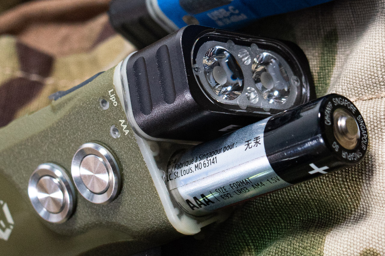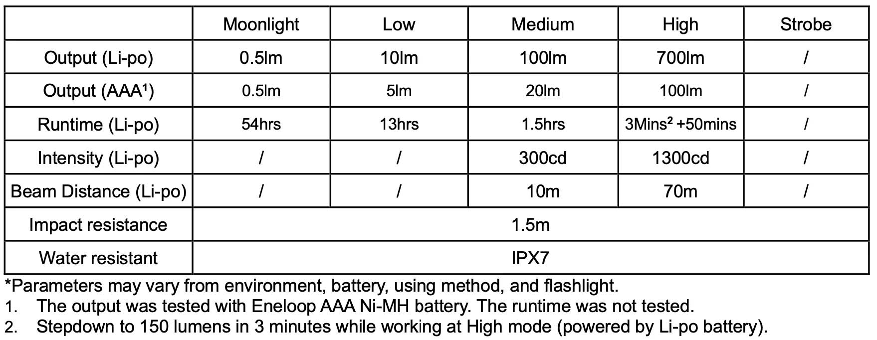 The Angel Eyes E1 is powered by the RovyVon hybrid battery system, the built-in Lipo battery is for daily use and high performance and the replaceable AAA battery is for long runtime like camping, hiking, etc., or where there's no access to charge the Lipo battery. The E1 body is made of polyamide that is lightweight and durable, it weighs 39g.