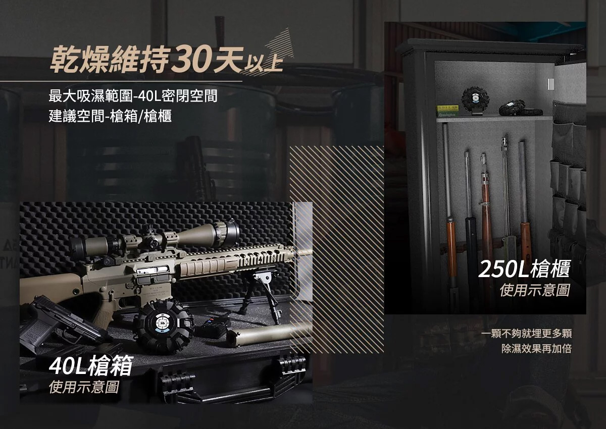 - 於40L容量之密閉空間,具有持續至少一個月的吸濕能力。