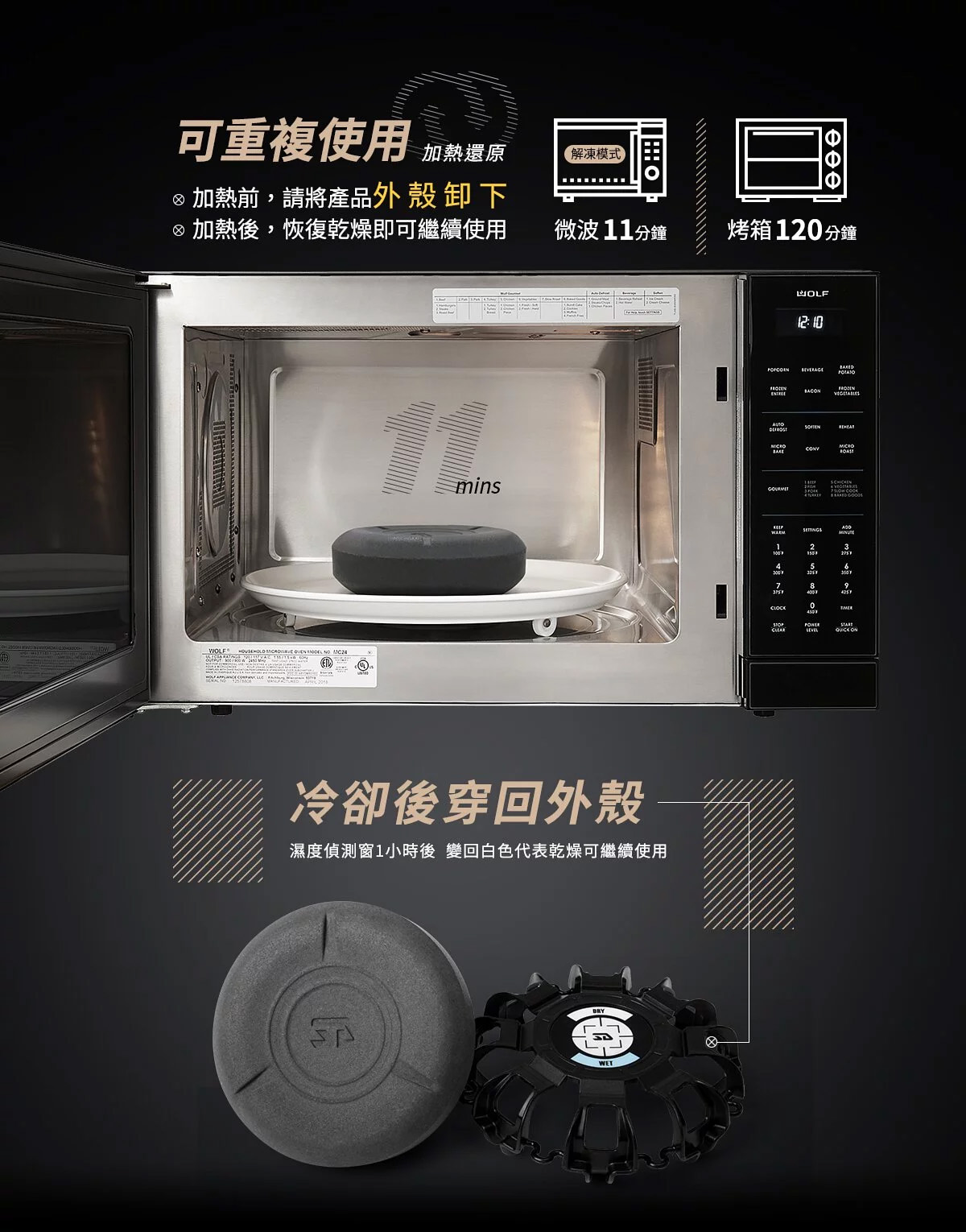 - 可利用微波爐或烤箱加熱除溼,濕度指標變回白色,即可重新吸濕。