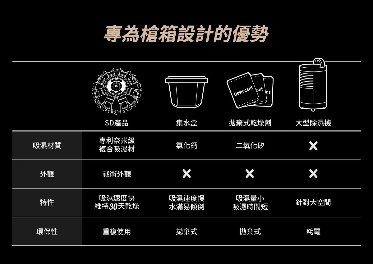 - 適用於各種須乾燥儲存的Airsoft玩具槍、BB彈、攝影光學器材、電池等產品。