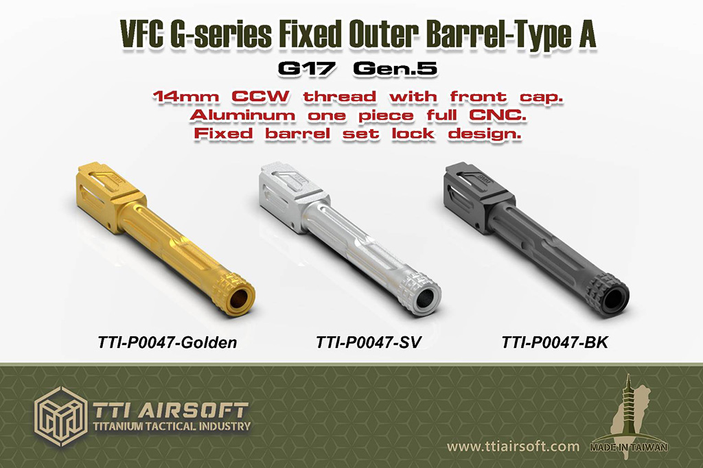 - TTI Airsoft CNC Aluminum 14mm CCW Threaded Fixed Outer Barrel Type A For Umarex / VFC Glock 17 Gen5 / G45 GBBP Series