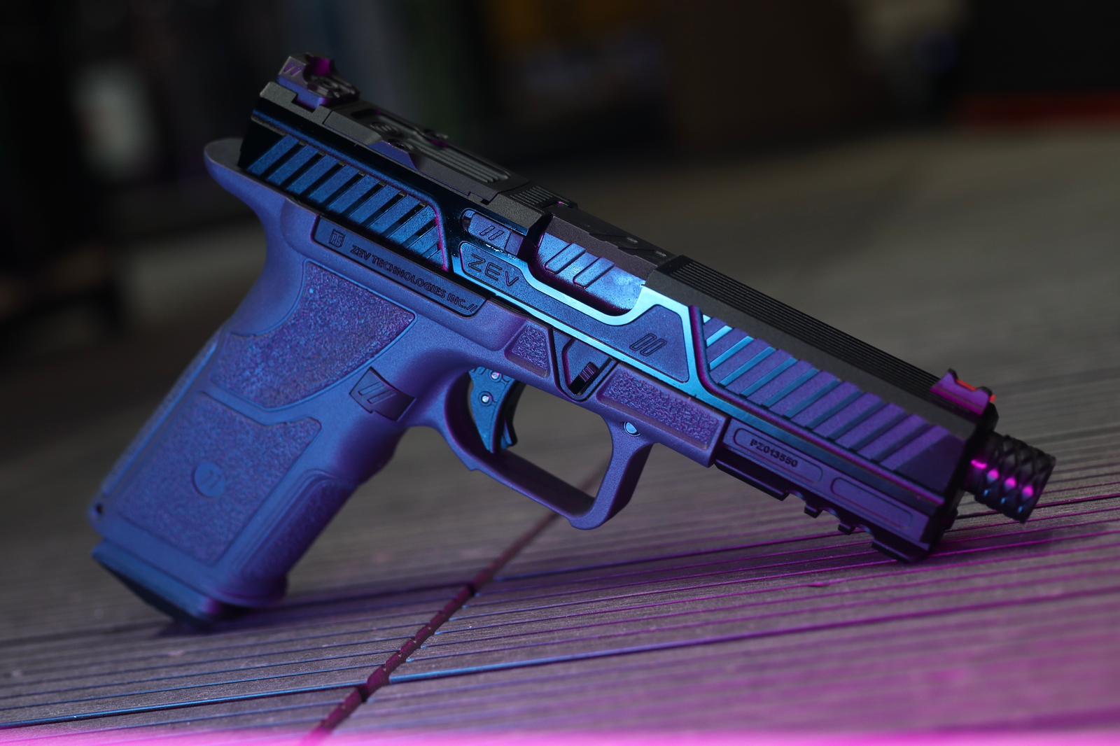 The PTS ZEV Technologies OZ9 Elite GBB pistol is a gas blowback airsoft pistol that faithfully replicates the appearance and many of the innovative features of the actual ZEV Technologies OZ9 pistol.